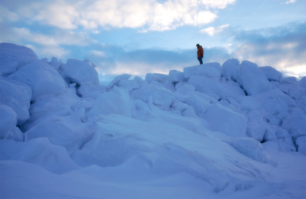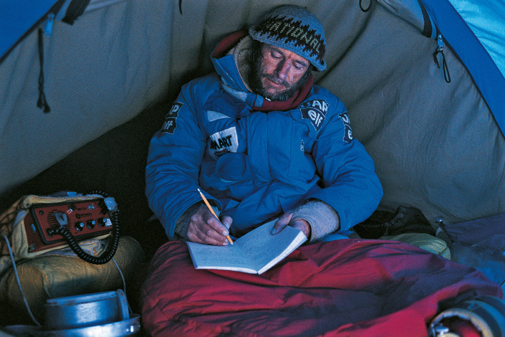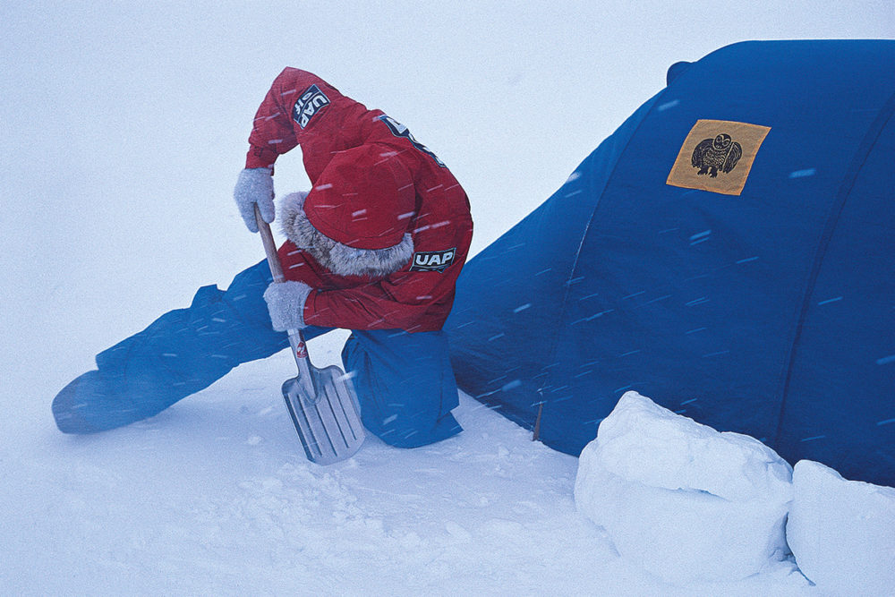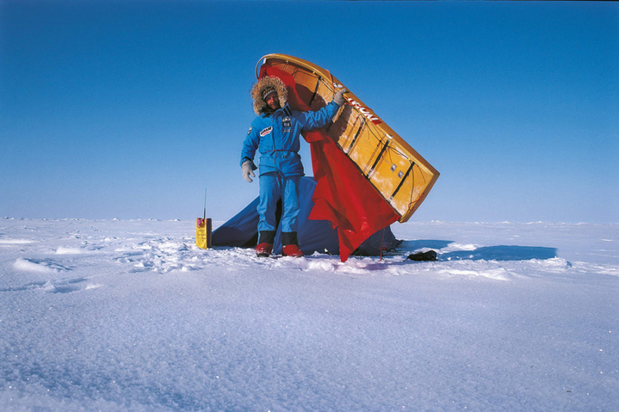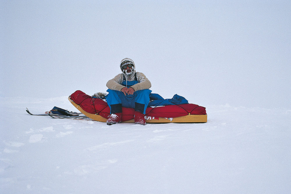 Left March 6th from Ward Hunt Island, in the extreme north of Canada, Jean-Louis Etienne arrives on the axis of rotation of the Earth (the geographic North Pole) May 14th, 1986. 63 days of walking and more than 1 000 km, traveled at an average of 20 km per day. Every day, he walks 8 hours in a row without being able to stop for lunch because of the cold weather. During the day, he feeds himself eating nibbles and dried fruits. Around 4 o’clock in the afternoon, he climbs the tent in a flat place, if possible sheltered from the wind. After a well deserved hot snack and a little rest, he communicates by radio and receives his position. Then it’s dinner time, then a restful night to face the next day. Apart from a few bear tracks, he will make only one encounter during his trip. On April 9th, he finds, by a complete coincidence, Will Steger and his crew, who goes to the pole with dog teams.